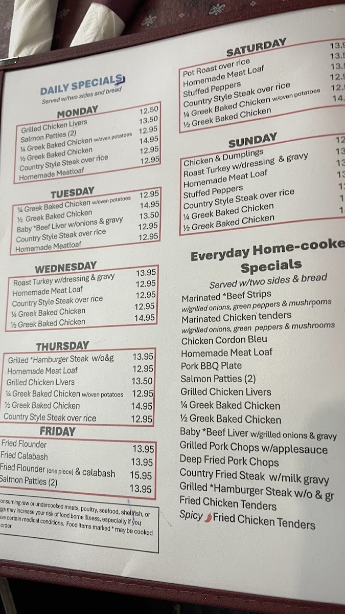 The daily specials bring variety with dishes like country style steak over rice, baked chicken with roasted potatoes, or fried shrimp and flounder, offering something a bit different while maintaining the same approachable, down-to-earth feel. Light sides including baked sweet potato, steamed cabbage, and pickled beets provide simple, fresh complements to main plates.
